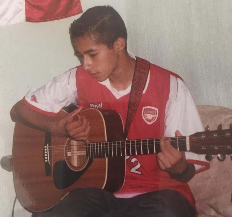 Mi pasión por la música comenzó cuando iba en la secundaria, en la clase de artísticas. Teníamos un profesor que se apellidaba Rene pero todos le decíamos el sapo, jajaja, aún me da mucha gracia recordar eso. Tengo que reconocer que nunca he sido un estudiante muy brillante, de hecho, salir con promedio de 6.7 de la primaria y 7 de la secundaria, no cualquiera. En fin, las cosas siguieron así hasta 3° de secundaria, yo era todo un gañan, me juntaba con los rudos, o con los burros para muchos, pero todo cambió cuando un amigo llevó su guitarra a la escuela, ese fue el momento en que me obsesioné con la idea de aprender a tocar. ¿Cómo era posible que nunca había desempolvado la vieja guitarra que mis papás tenían en casa? Anterior a esto lo único que hacíamos con el estuche de la guitarra mis hermanos y yo era aventarnos por las escaleras de la casa, utilizando éste como avalancha.